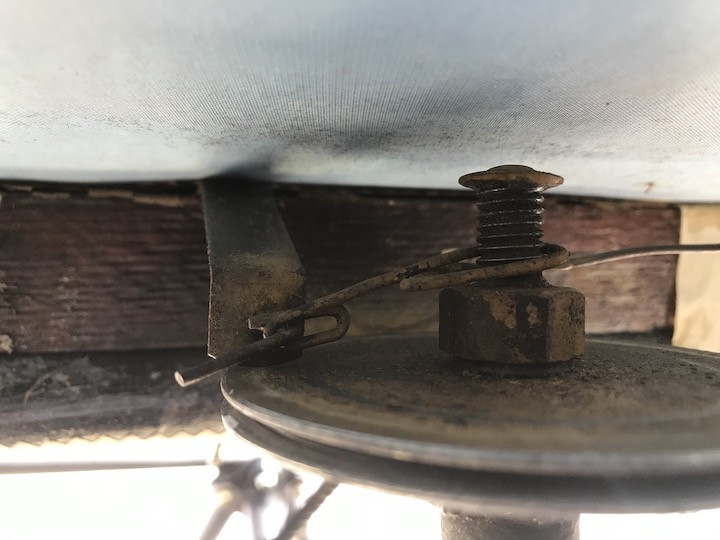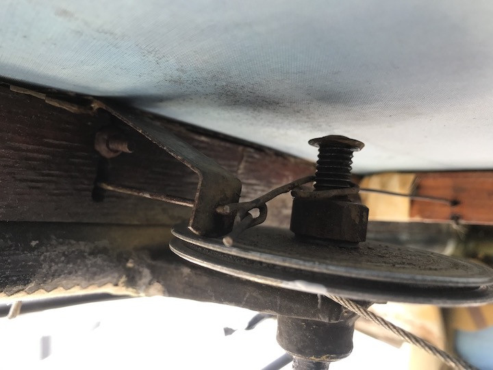 I compared my indicator to that of Rob and Buell's, but there's little comparison. The apparatus that drives the left and right movement is not the same. While Rob and Buell's indicator employs rigid structural components that are fixed to the cross member above the windscreen, mine uses a heavy wire attached to the stringer over the passenger's head that is eventually connected to the screw above the pulley.