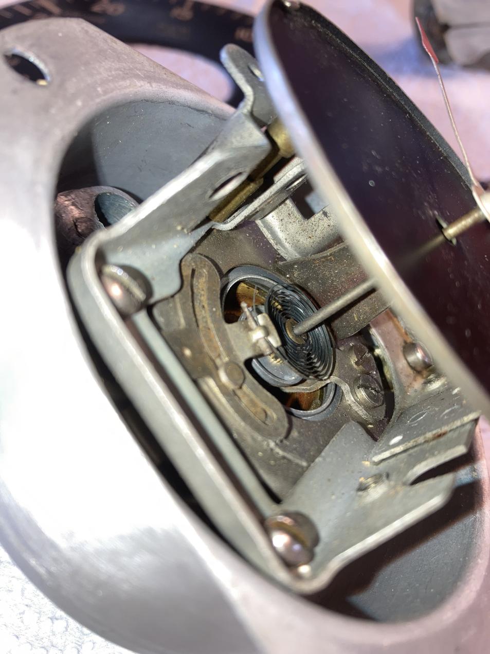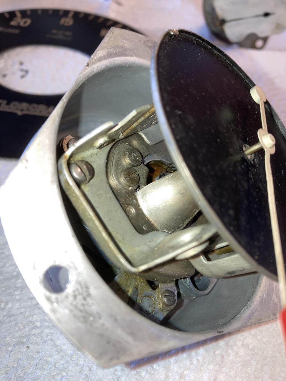 Ok, for all you looking for pictures of the assembly of a big tach with oil temp and oil pressure. Here you go. Word of caution here; I do not recommend attempt disassembly. Pictures provided for entertainment value only. The meter connections to the bourdon tubes are very delicate as well as the tach spring-shaft assembly. High Risk of permanent damage and loss of calibration! Removal of the glass from front cover very risky. Note the staked points in the front cover. Probably a find another good cover kind of repair if yours is damaged.