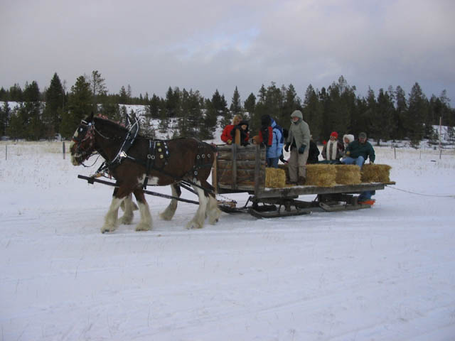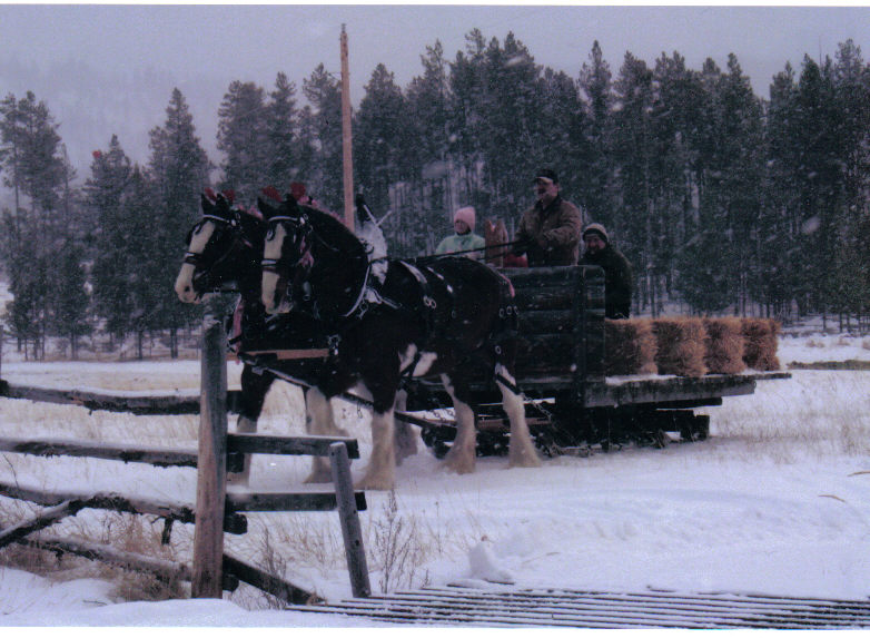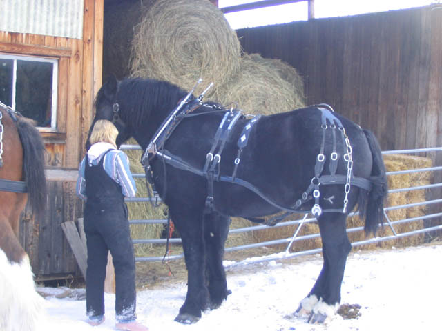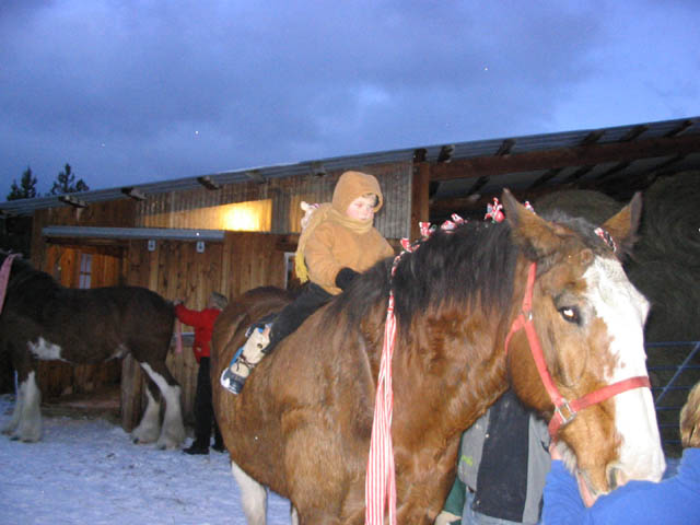 The horses are doing fine. Hooked a pair of the Clydes up the weekend before Christmas and gave all the neighborhood (as well as not-so-neighborhood) kids of all ages a hayride...had over 100 through here throughout the day! It was a blast, and we were taking harness off after dark! The little guy is my sister's grandson..he really likes those big horses!!