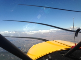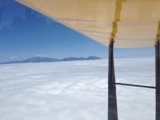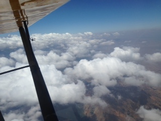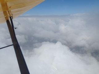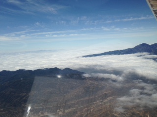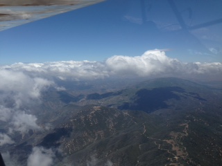 It looked like the weather and traffic gods were conspiring against me for a Friday departure. First a jack knifed 18 wheeler in the Santa Ana canyon turned a normal 1 hour drive to Riverside airport into a 3 hour wait in traffic. Once getting to the airport a heavy marine layer and a low ceiling prevented a departure. Stayed in the hanger over night to get an early departure on Saturday and woke up to another heavy marine layer. Around 9:30 am I spotted a whole beginning to develop south of the field over Lake Mathews. I was wheels up by 10:00 am and spent 20 minutes climbing in circles in the hole to get on top which was 6,000 ft.. First picture shows the edge of the hole just as I was getting on top. Next picture shows the San Gabriel Mountains. Under all those clouds is Bracket Field where poor George Wacker was stuck and unfortunately could not make the Rendezvous. My plan was to cross over the Tehachapis on the western end closer to the Tejon Pass. Past experience with southerly winds down the valley has been the clouds back up further at the Tehachapi Pass. Since I was fighting a head wind I knew that when I approached the lee side of the Tehachapis I would encounter a down draft so I climbed to 9,000 ft plus. The next photo is off to the west and you can see cloud cover Tejon and the last photo is where I passed over the Tehachapis. When I hit the lee down draft I started to loose altitude until passing the ridge at 6,000ft using the sail plane tactic of lowering your nose in a down draft to get through it quicker. I then dropped under the scattered clouds which were at 6,000 to 3,000 and headed straight towards Columbia. I would have preferred to fly on top for a smoother ride but head winds were too great. This made for rather a bumpy ride. After passing east of the Fresno airspace and starting to cross the Sierra Nevada foot hills the ceiling starting dropping and I could see rain cells ahead. So I diverted to the valley. At this point it was 4 hours into the flight and I had a physical need to land decided to divert to Oakdale O27 because the gas was $3.99 a gallon. Landing at O27 I flew 4 hours and 40 minutes, 384 miles, average ground speed of 82 mph and took on 20.45 gallons for a burn rate of 4.38 gallons an hour and an average of 18.78 miles per gallon.