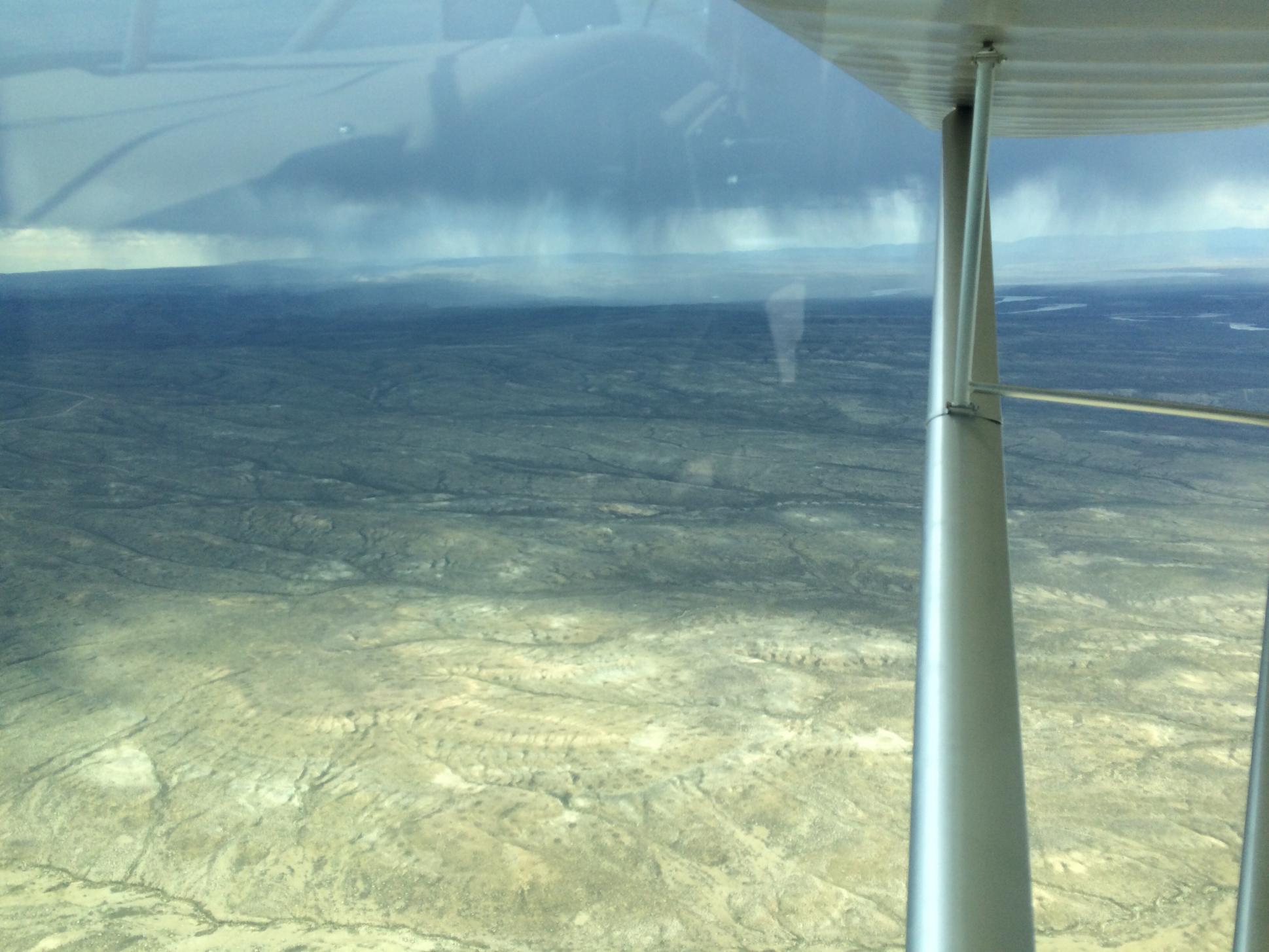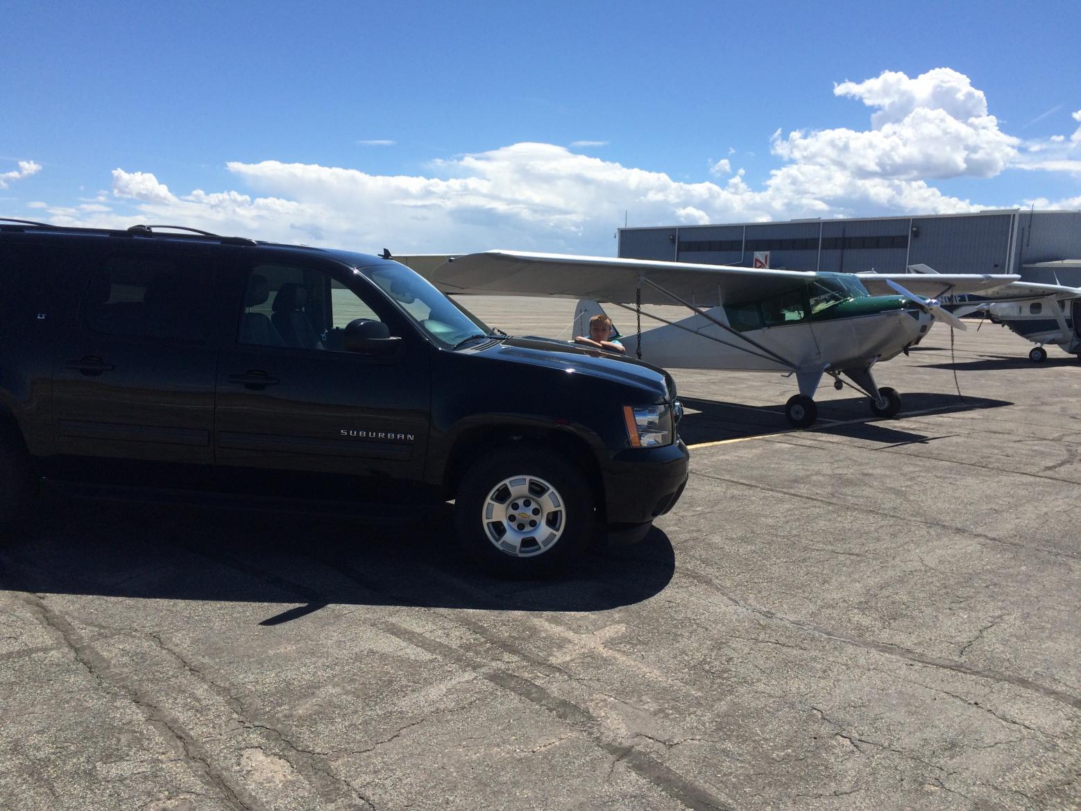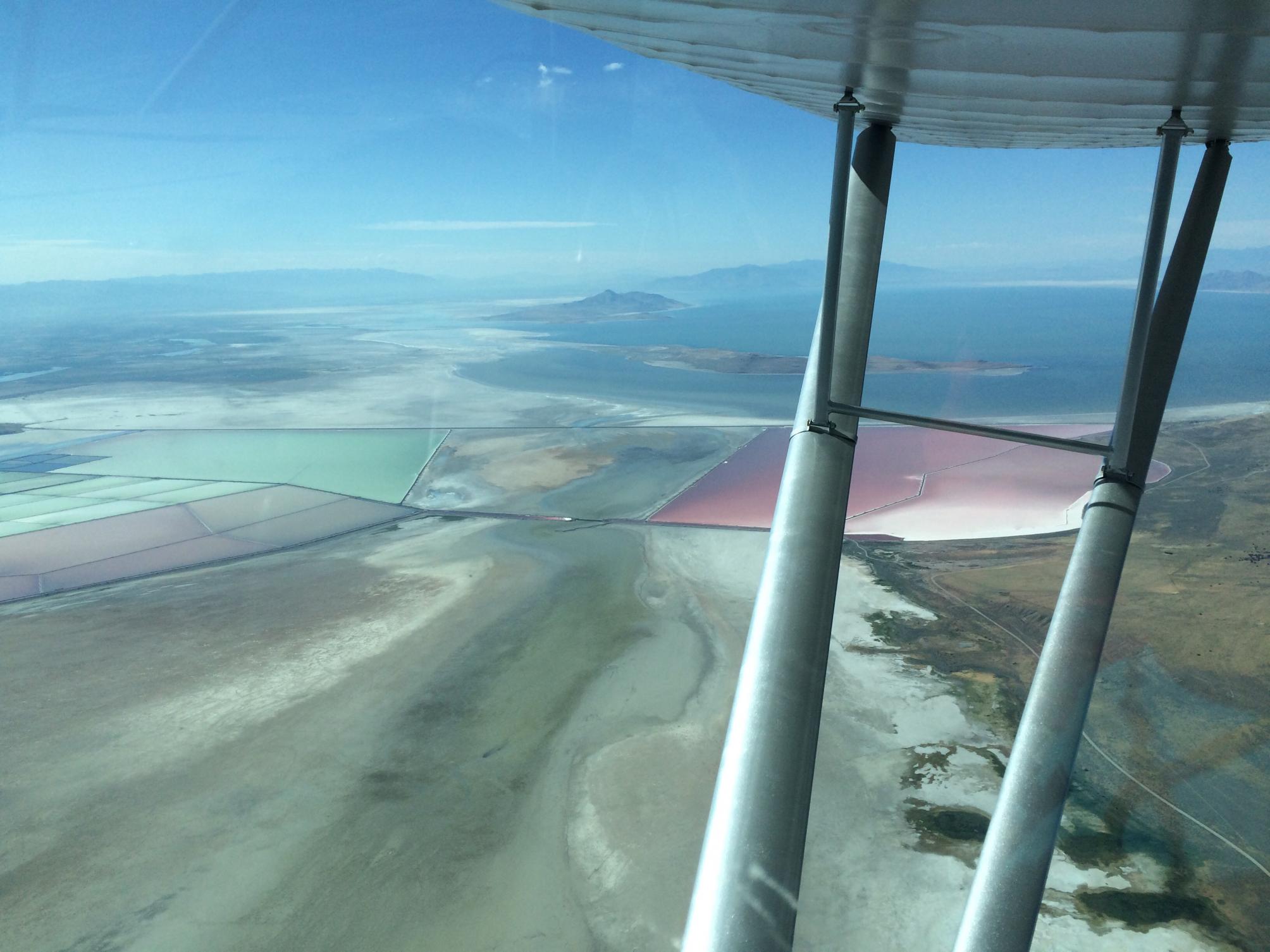 Day 2 up early with clear skies. Climbed out to 10,400 ground speed for the first 2 hours was only 73 mph. More mtn and high desert. Pretty but everything looks the same until Salt Lake which we flew over 26 miles to cross. Crazy colors in the salt. Flew the north side of the class B which was my most nervous time of the trip so far. If you look close on the Garman map it shows the flight paths of the airliners. I was flying right through it. The airlines would be at 7500 so I felt it would safe enough with us at 10,400 and as it turned out we didn't see even one plane. Once past Salt Lake City we cross back into some ver pretty mtn with lakes in the valleys. Speed also increased. Stopped in Evanston Wyoming bought gas then asked the office if there was any food close by. He tossed me a set of keys and said to take the airport car. New Saburban. Nice. Density altitude 9,500. Wondered if the Tcraft would fly or just taxi down the runway. Longer than normal roll buy wants in the air 200 fpm I'm happy with that. Flew over closer to the mtn hit some up draft 800 fpm back to 10,000 ft in no time. Ground speed for the rest of the day ran btw 103-118 mph. Thunder storms now to the south with lighting then more to the north with lighting. We turn north to get around the first then once we got around it turned back south then all hell broke lose. Raining pretty hard and at the same time Zachary and I both announced that our legs were getting wet. Lol must have a leak somewhere. Landed in Rawlins Wy where we bought gas tied her down and found shelter from the rain. Bob the airport guy let us stay in the pilot lounge for the night. Bob is an awesome guy and if you are in that area be sure and stop. Gave us a break on the gas because we're Oshkosh bound. 5.6 hrs flying time 21.4 gallon 350 miles