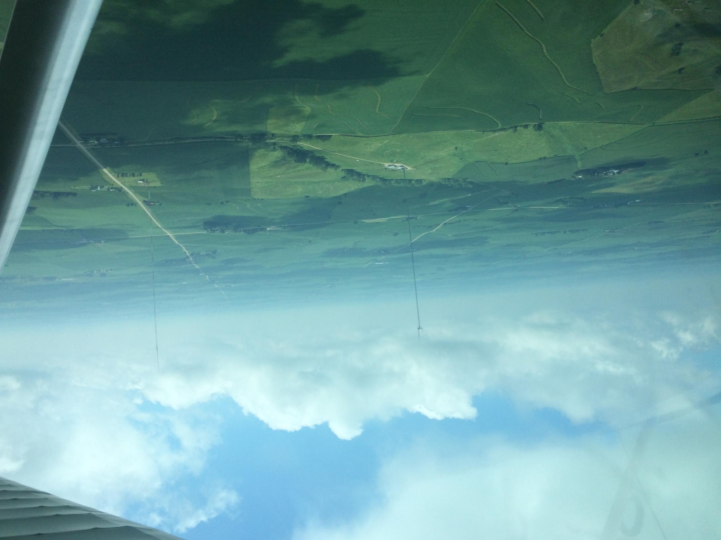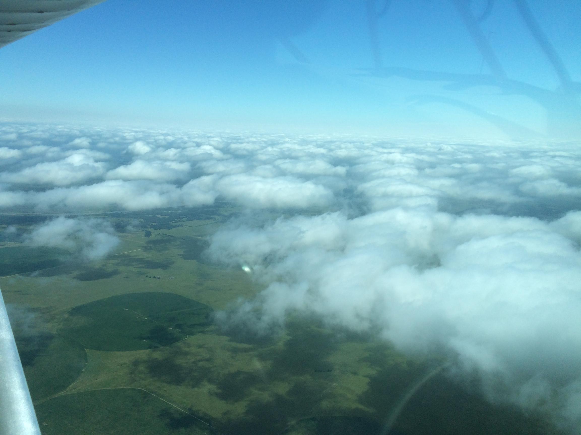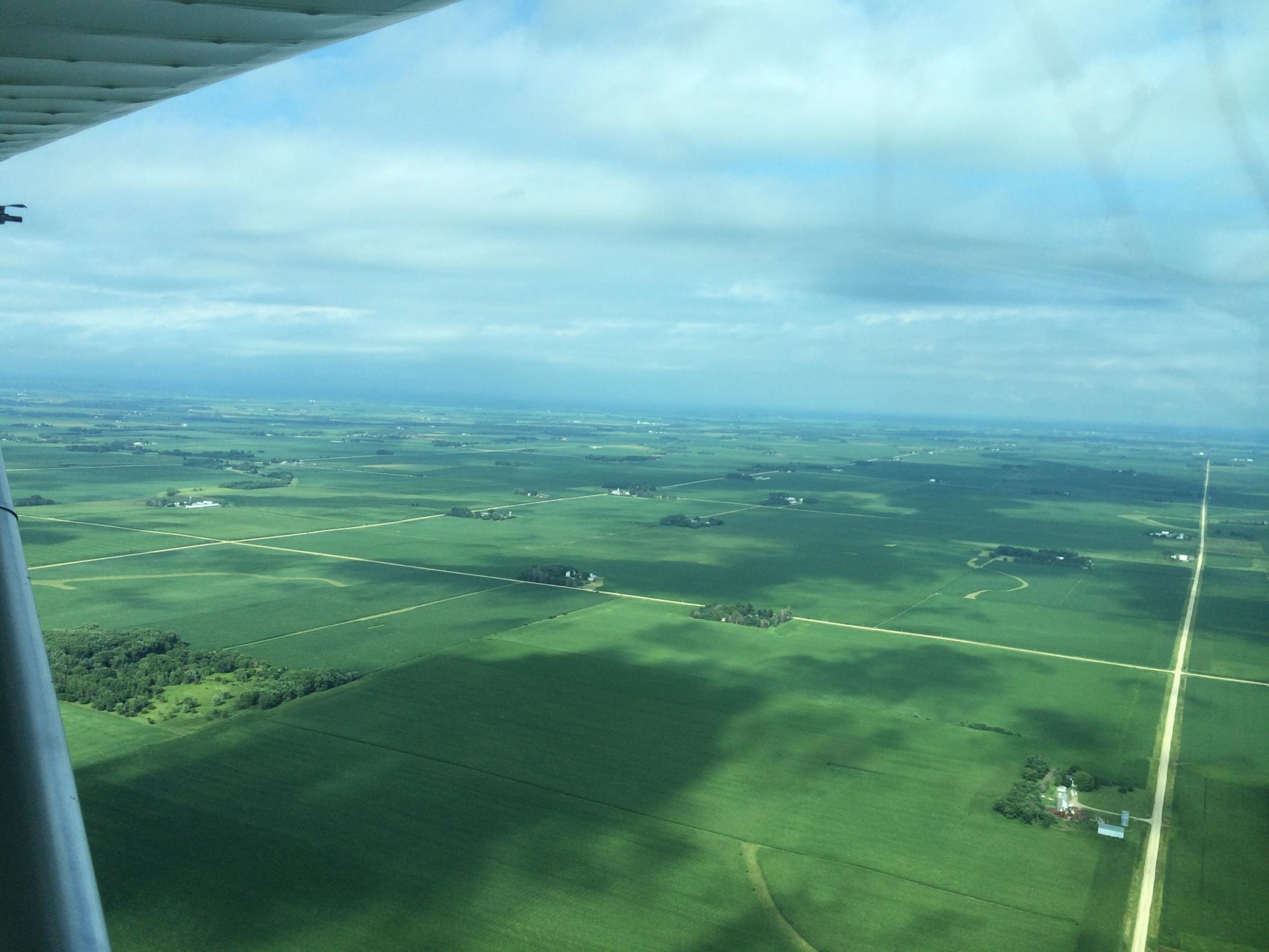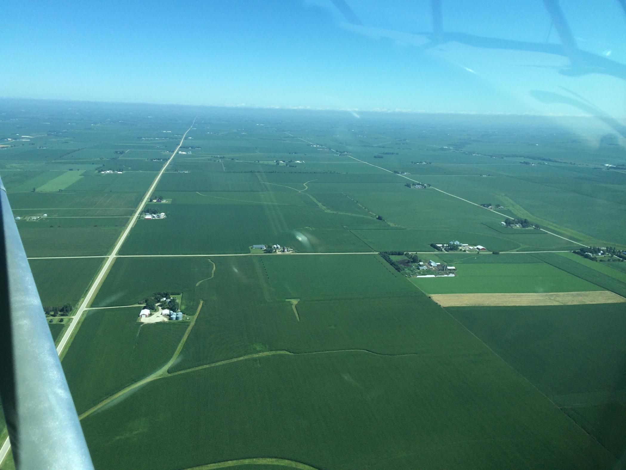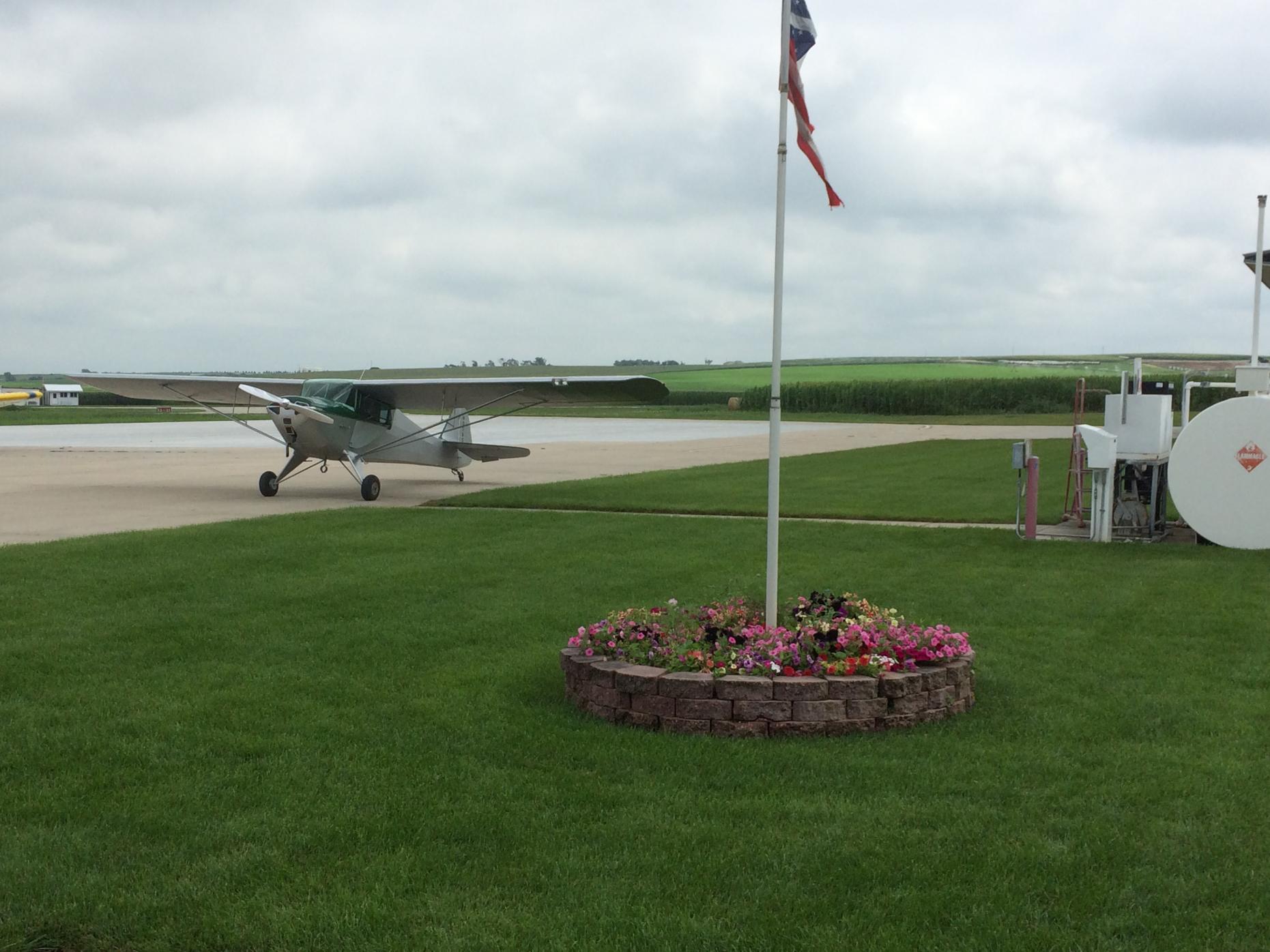 Day 4 Valentine Ne. Up early had breakfast and headed for the airport. Blue sky and no clouds. Thunder storms to the east but moving away so "Lets Go" T-craft was all wet so wiped the windshield off and added our first qt of oil (15 hours) Flew east about 10 miles then ran in to ground fog. I looked it over from 5000' feet and said "No I'm Not Flying over that" so returned to Valentine and told the hotel office that had locked ourselves out of the room. Back in the room watching TV for a couple of hours. Took off at 10:00 found it clear and smooth. Later we were flying under a cloud layer at 3,000' when I looked up and saw tw0 3,300' radio towers. Couldn't believe it!! Got to stay alert. Landed in Hartington Ne for fuel and lunch. Another airport car then to town for pizza. More farms with corn everywhere. Everything is so green here. Landed in Waverly Ia. Fuel, dinner and slept in the pilot lounge. So many fire flies some even the the office. Zachary loved it.