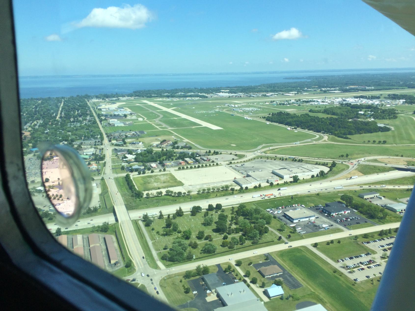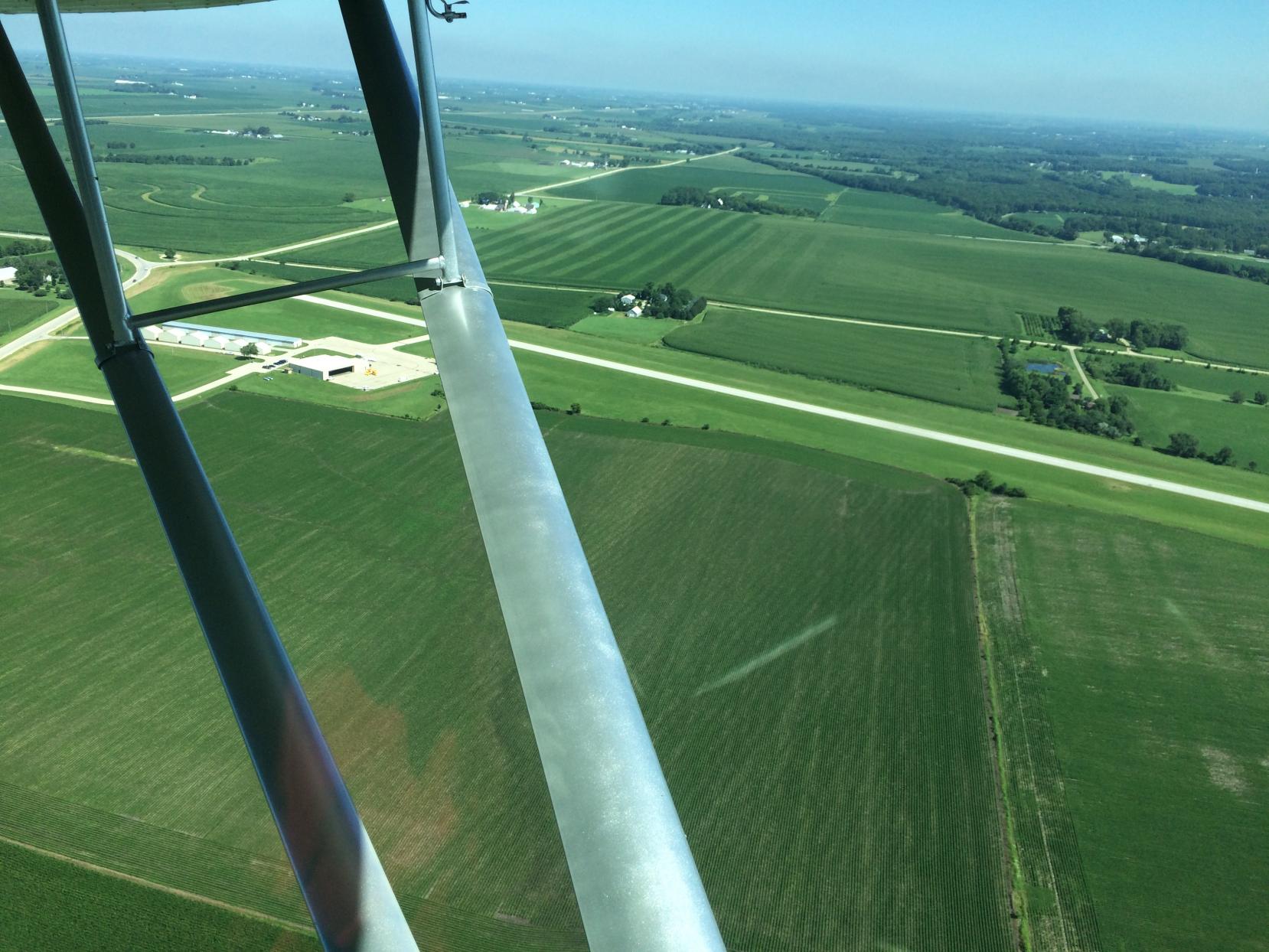Day 5 Waverly Ia. Found the T-Craft sitting in fog this morning so no early departure. Went to town for breakfast where the waitress was telling us about how cold it can it here. She said it got to 50 below a couple of years ago and that the water pipes froze under the houses. Some people left and went south for a month or so. Doesn't look like that now as it is so green here. Back to the airport and departed into clear skies with a few clouds. Country side here is very flat with lots of farms. Mostly hay and corn. Very pretty and we love flying about 2500' looking down at the farms and laughing at some because they have so much junk hidden behind the house. Only way to travel and enjoy the day is to fly low and slow. Speaking of speed ever since Salt Lake City we have been cruising at about 95 mph. I normally cruise at about 88-90 mph. Once we crossed the river into Wisconsin we found mountains, more clouds and the advisability dropped to 1.1 miles at Bocobel Wi. Couldn't see much as it was so hazy. When we landed Zach says Grampa I heard metal crashing. I didn't hear anything but once at the gas pump I notice that the spinner was got from the prop. Zach and the gas guy took a golf cart down the taxi way and found the spinner with just a small scratch. Zach and the gas guy made repairs. Just a note in that that morning I notice a funny vibration and once the spinner was replaced she was smooth again. Went to town and had lunch and a milk shake. So humid today you can't breath you just swallow. After lunch checked weather to Osh and found it clear all the way. As we approached Ripon I was so nervous but as it turned out a couple of planes followed us in and we had no one in front of us, piece of cake. Once in down wind the tower ask where we were from I told him that after 5 days with 21 hours of flight time we were from Fresno California. He thought our T-craft looked great and thanked us for coming. Cleared us to land on the green dot and once off the runway the ground crew took us to our camping spot. So easy! In a very short time I had lots of guys checking out the T-craft. Everyone loves the chrome. 217 miles 2.4 hours