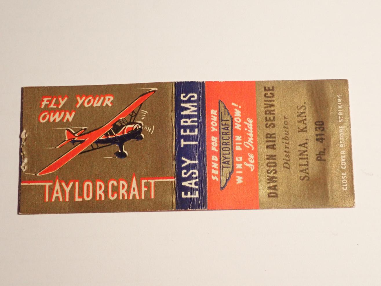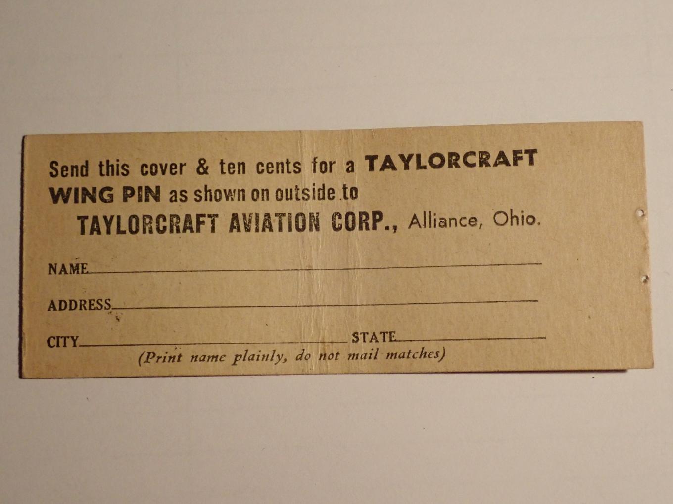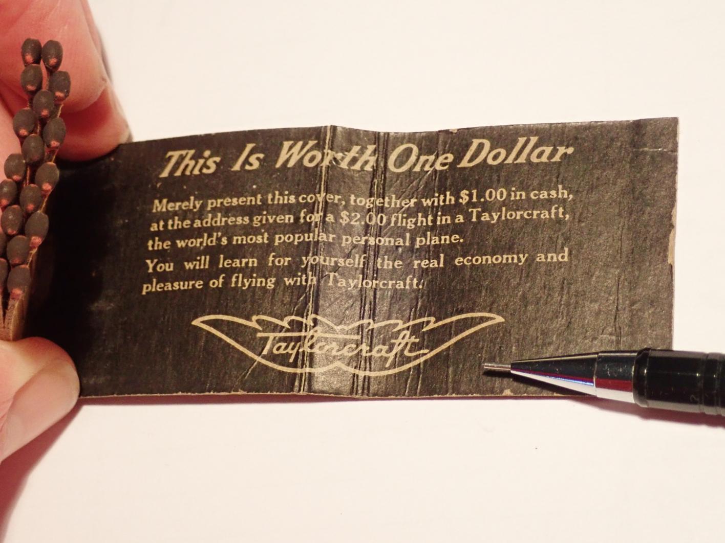 Taylorcraft used matchbooks for advertising and I have seen two types. One is to present at your dealer in addition to $1 for a $2 ride. The other is to send away to Taylorcraft for a pin. I have some matchbooks with the red over black paint scheme and seen one with the Blue, Yellow stripe. (which the post office lost, so I don't have one).