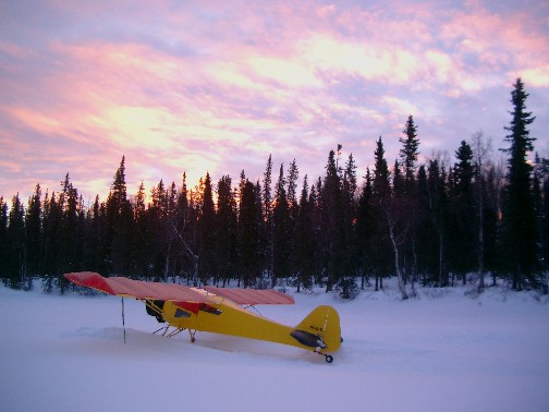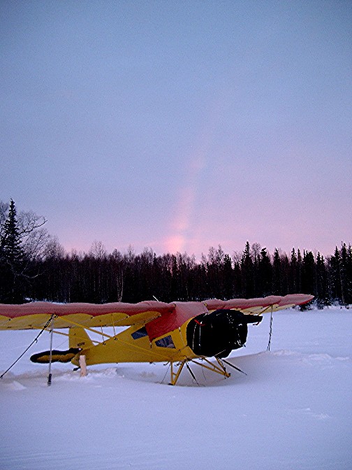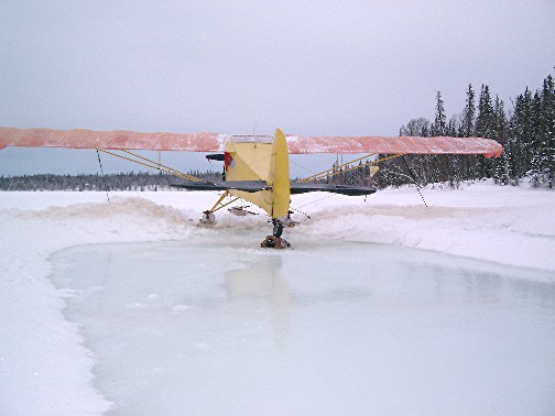 The Alaskan tribe will know what this is all about! There are about 8 inches of water on top of about 2+ feet of ice. The weight of the snow has forced the ice down and water has found its way around the outer edges or up through cracks or icefishing holes. I wound up setting down in the water while lifting the tail and setting it on the block of firewood! Hopefully a couple of nights of freezing wx will firm up the "pond". You'll notice the skis are blocked up off the ice, to avoid having them freeze down. Anyone else fighting this? Dick