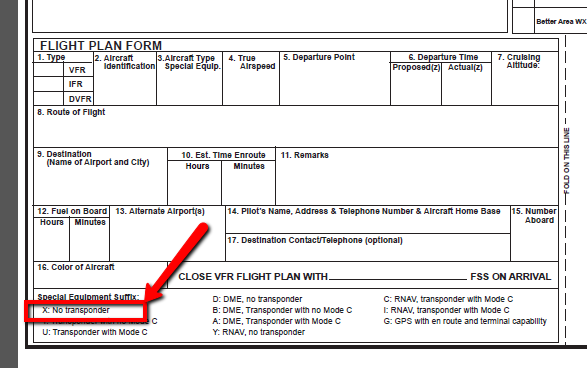 If memory serves me correctly, the "X" means "negative transponder". Can't find my documentation right now so I might be off base. OK, I did find a reference to X meaning no transponder on an AOPA Flight Plan form (attached).
