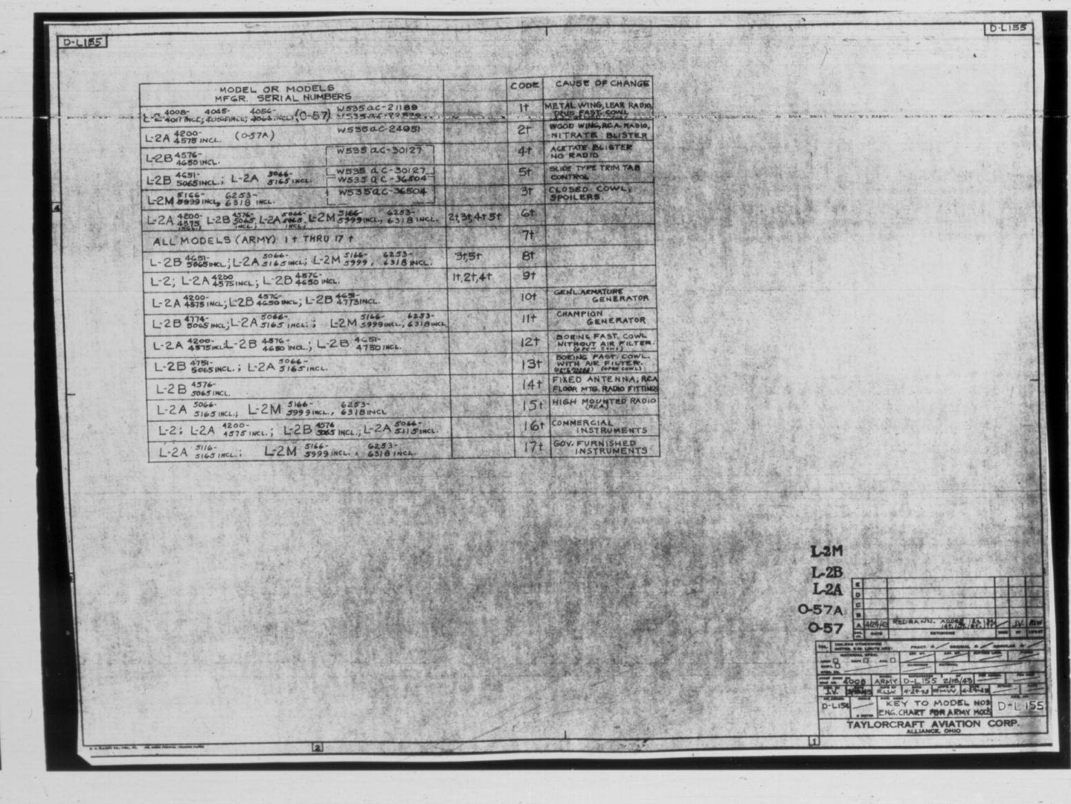 I wonderr if any L2 or D model gurus out there can help me? I have found an aircraft that is on the FAA registry as a DCO-75. Is there such a thing or is the FAA record in error? Also, I don't know if this is an L2, L2-A, L2B or an L2-M. Is there any reference that can compare Taylorcraft serial numbers VS Army Serial numbers? Any help is appreciated.