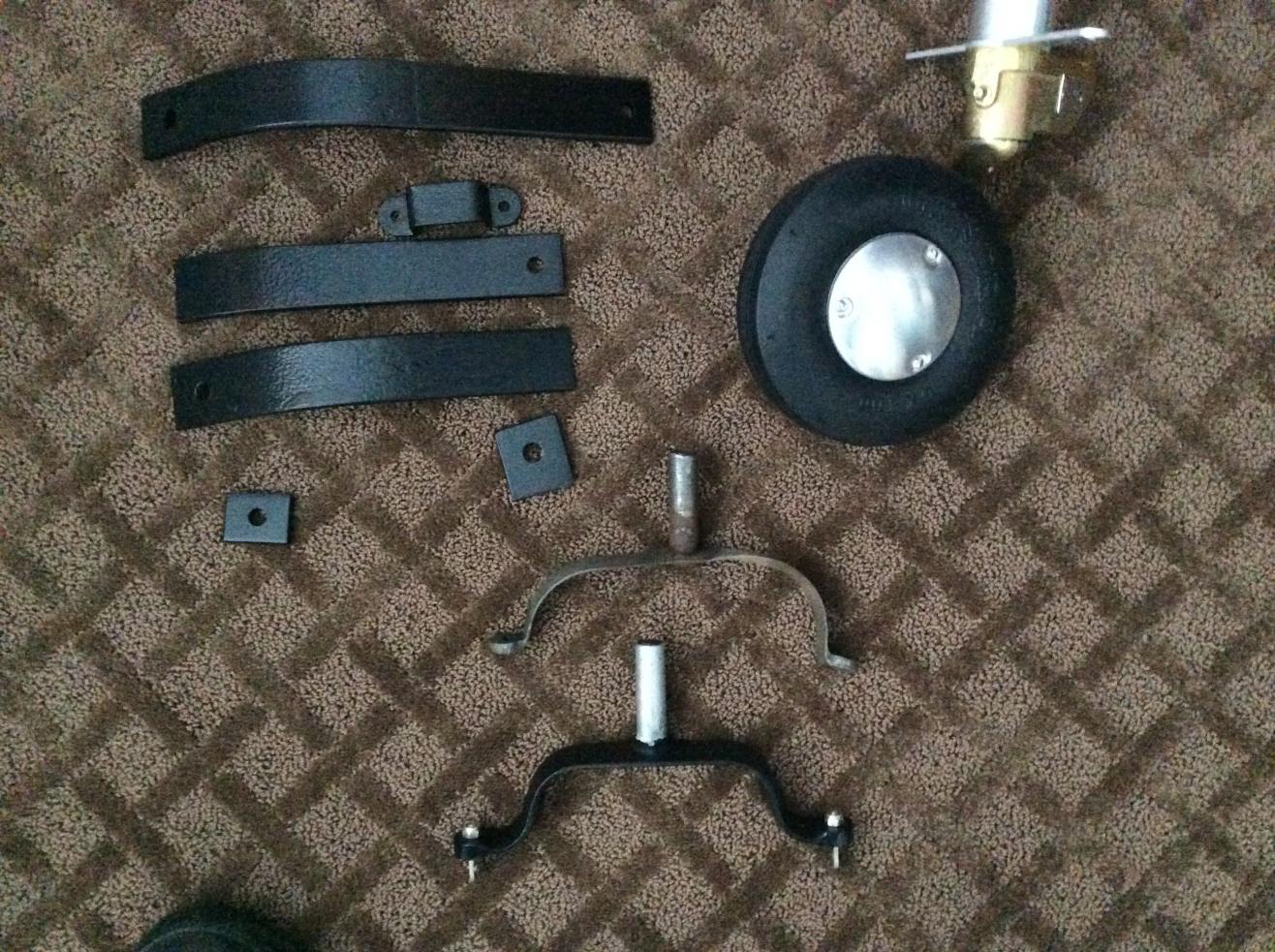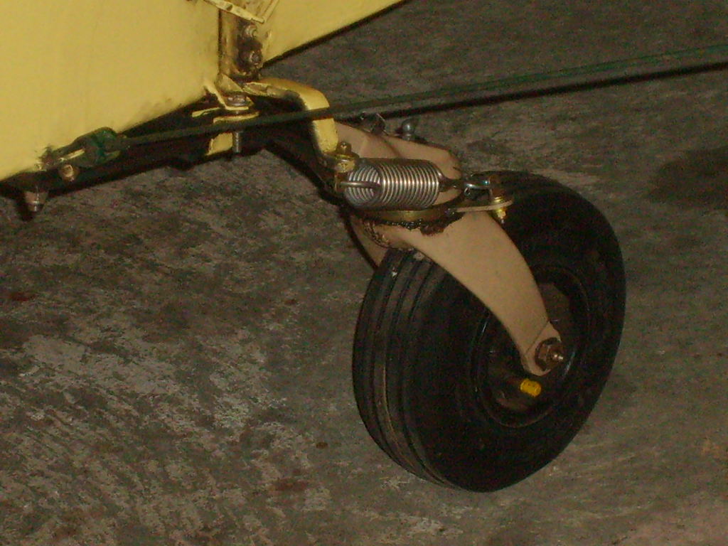Springs should be set up like this. Top spring is short on the back, second spring is short on the front, third spring is full length. There is a metal spacer between the front ends of the spring (washers on this one). There is a RUBBER pad between the strap and bottom spring at the back, NOT FELT! It holds water on the spring! There is a bushing in the fuselage the front bolt goes through, DON'T loose it! The spring can rock back and forth with it missing and tear up teh wheel as well as making landings a LOT more exciting than you will want!