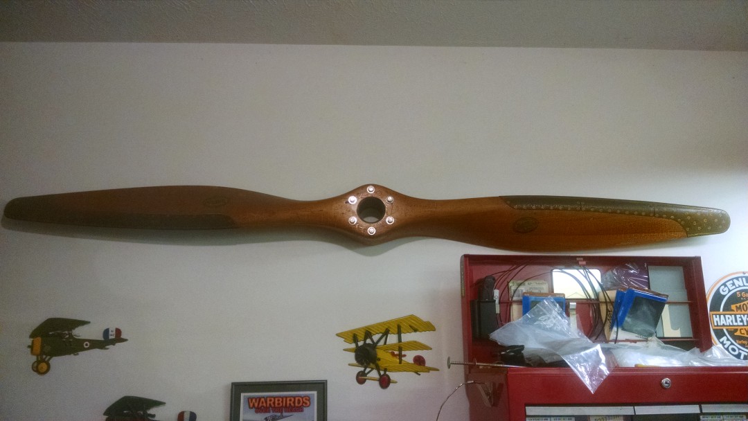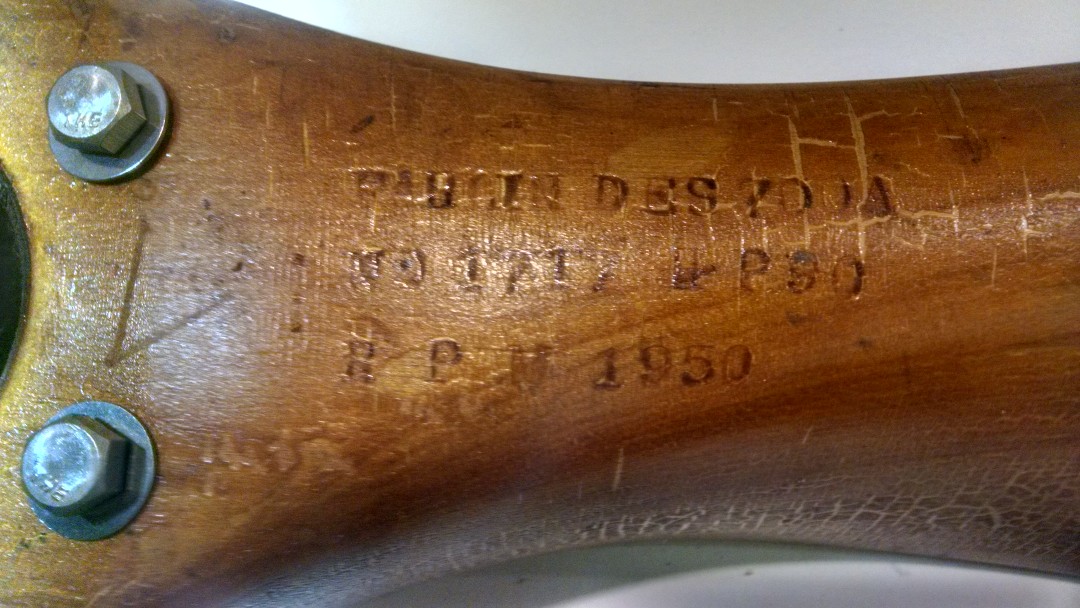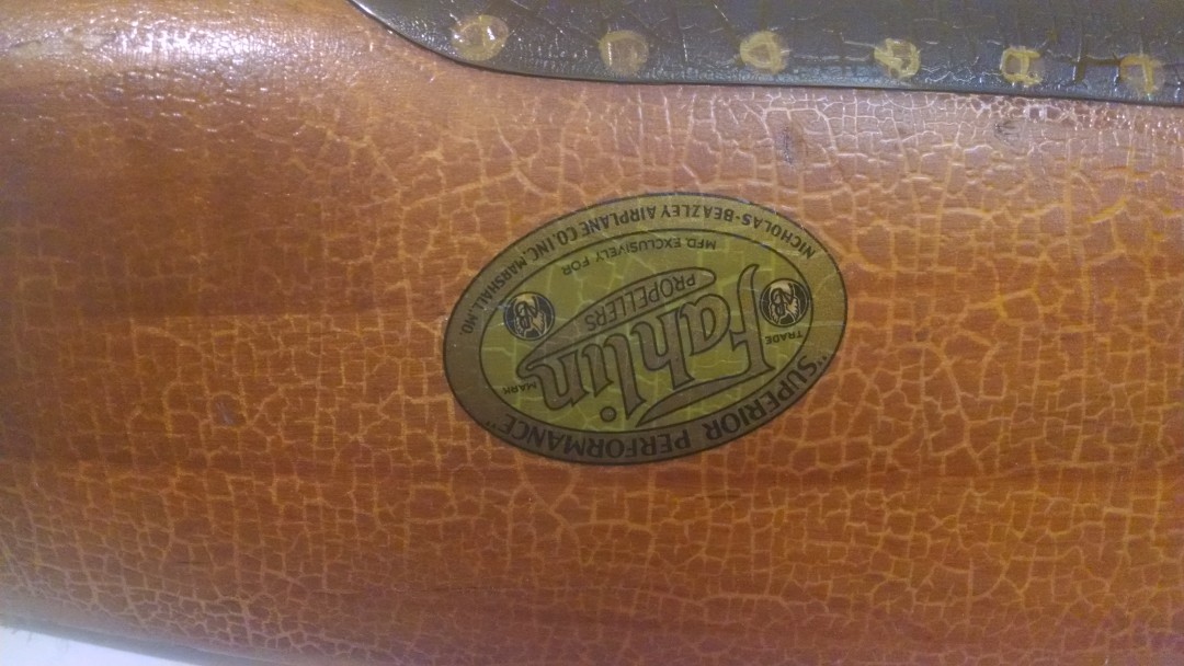 This is a Fahlin prop brought back by my mother from Columbia University in the 40's where she flew in the aviation program. She also flew Taylorcraft's here in Springfield, but mostly Aeronca Chiefs at Columbia. I looked up the specs on this prop but cannot remember, off-hand, what it went to. Definitely not an A-65. Supposedly the prop was unairworthy so a mechanic gave it to her as a souvenir from her school. I cannot find any damage on it. Obviously the years have taken a toll on the finish, but it is kind of a neat alligatoring effect.