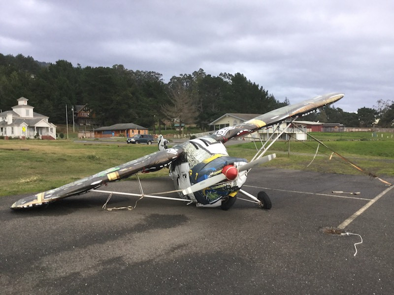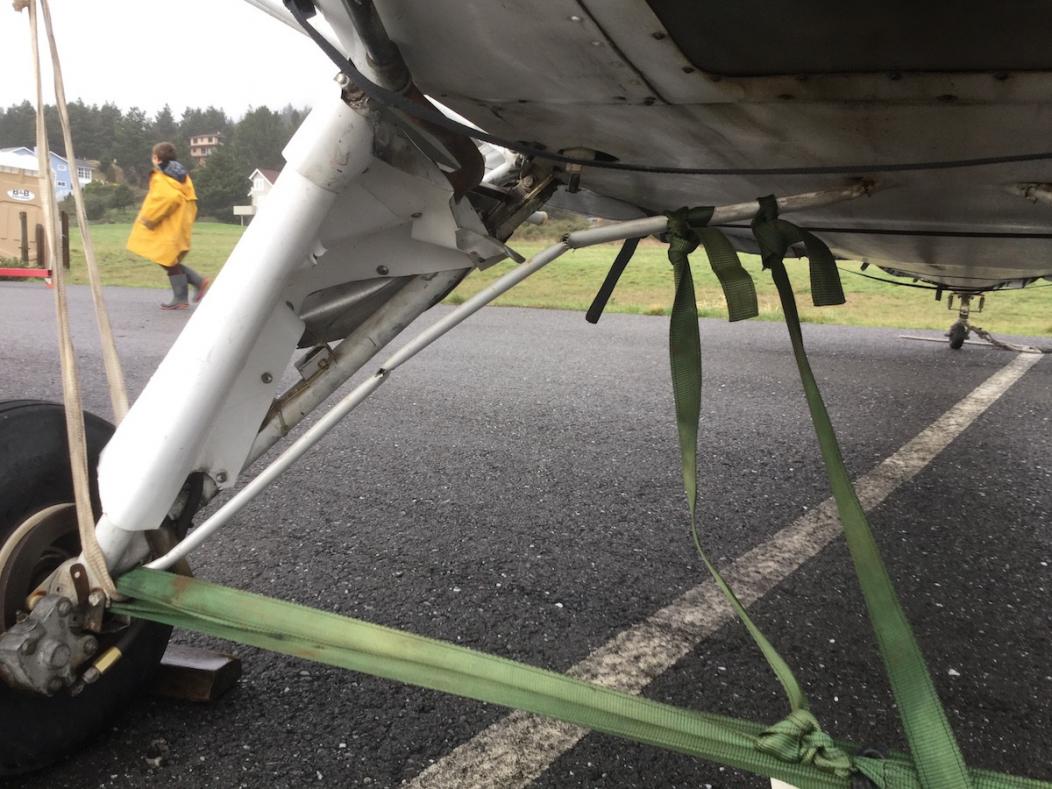 Gusts of 60 mph, tied down, and she broke the old cotton ropes and flew, sideloaded the gear and collapsed. No visible corrosion on the inside of the tie strut.