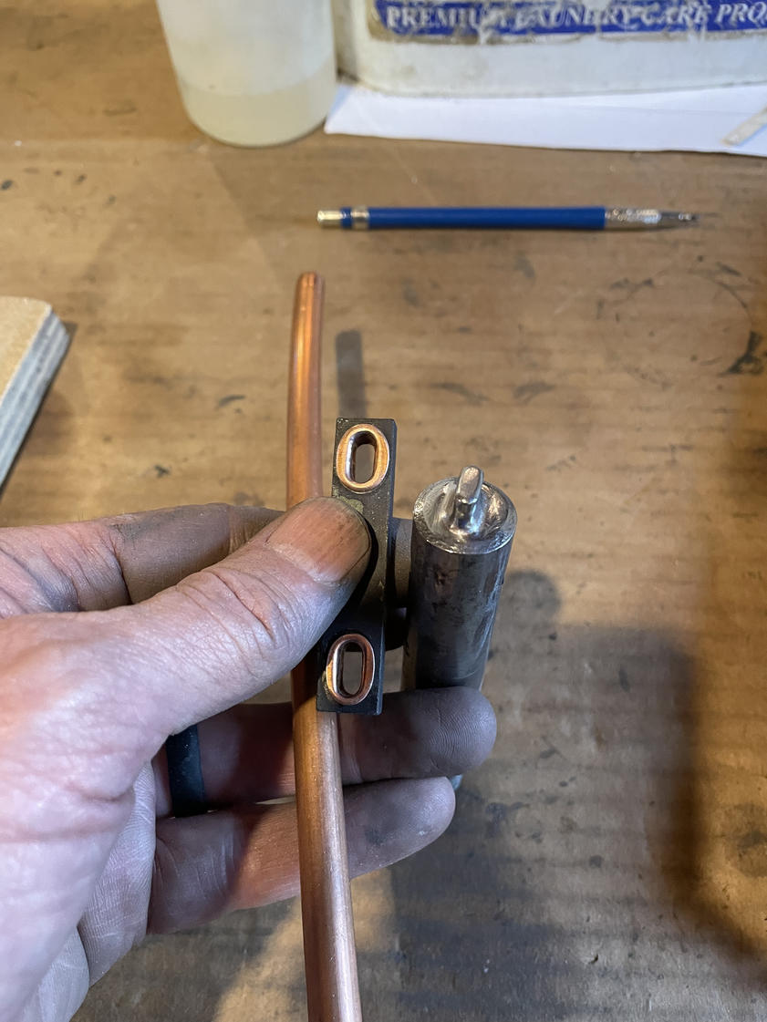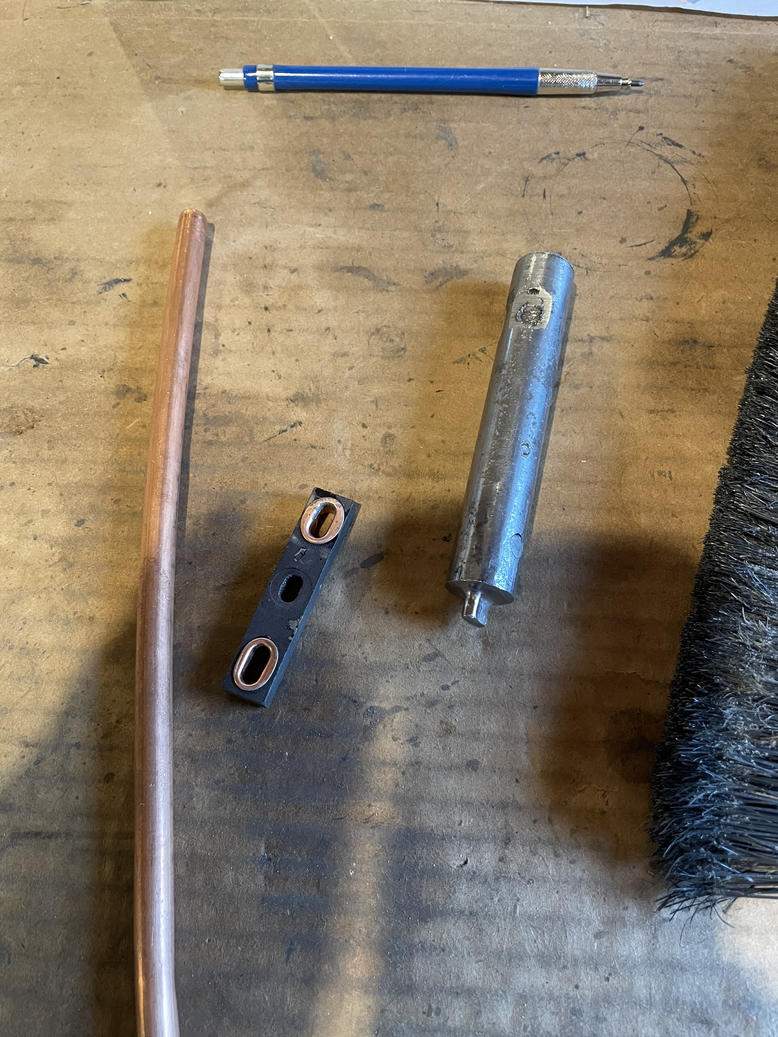 The trim cable had sawed the originals. 3/8" ductile refrigeration tubing appears to be identical to what was there. I squashed the tube in my vice to the shape of the opening in the Bakelite block and smoothed and polished the cut ends of the tube so they wouldn't split. just lightly tapped the tool into the opening from alternating directions while supporting the other side of a flat smooth hammer face(hammer clamped in vice)