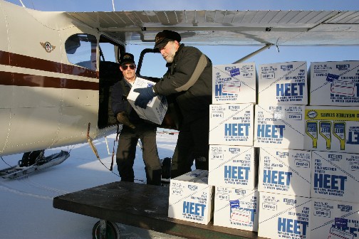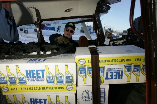 Forrest, this picture from the Iditarod Airforce gives all new meaning to the phrase: "Packin' Heat"!! The mushers use the "Heet" to warm and cook their dogfood on the trail, during the Iditarod Race. The Iditarod Airforce guys fly about 700 cases of "Heet", along with a lot of other stuff, out to the various checkpoints along the 1100 mile route. This link from last year's race shows some good pix of the pilots' activities during the race.
