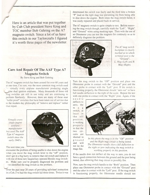 There is a very good write-up in the March 2004 Taylorcraft owner's club newsletter that gives in detail how to take an A7 mag switch apart,test,clean, and reassemble it with illustrations. If anyone wants a copy I would be glad to send them one. I will be leaving Friday 18'th and be back the 25'th so anyone needs one in that time I will send it when I get back.