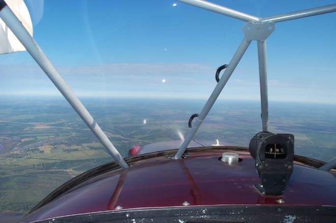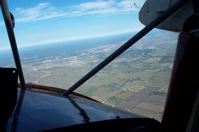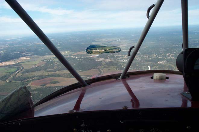 Takeoff again into a perfect South Texas fall day. I fly a 5 mile perimeter around the edge of Orange Grove Navy Aux Field to avoid jet blast on my fabric and dope. Set course for Greater San Antonio. altitude 4500, ground speed 80 kts, visibility incredible, and 2 hours later back at Bulverde.