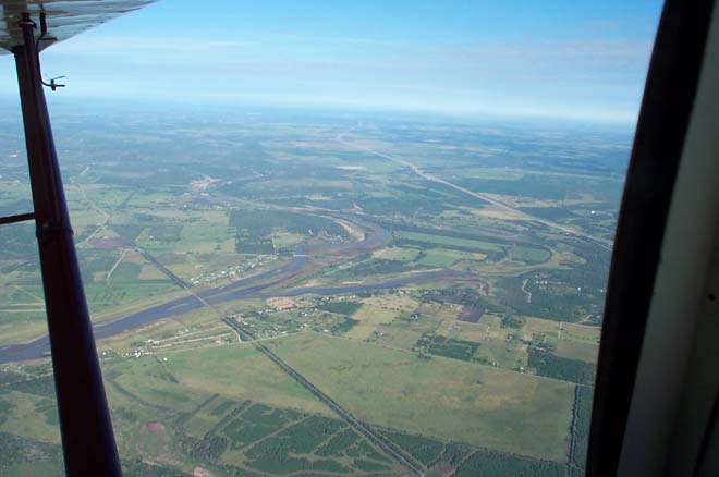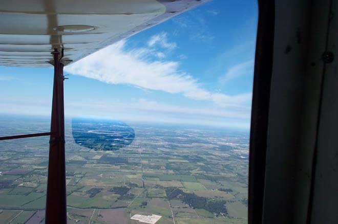 A couple words about the photos. South Texas is a flat coastal plain with meandering rivers and no natural lakes. It is subtropical, and this time of year fields are being prepared for crops such as cotton and corn. The Balcones Escarpment is limestone which abruptly rises about 300 feet on a line from San Antonio to Austin - roughly the route of Interstate 35. West of the escarpment is the Texas Hill Country which has rocky soil suitable for goats and limited cattle ranching unlike the fertile coastal plain. It is not uncommon to hear the somewhat derisive term "goat roper" in these parts -- but you better smile if you say that. I highlighted Randolph AFB with its two parallel runways. Photo was from 4500 feet MSL and 7 miles away. I also highlighted Bulverde 1T8 airport. Photo was from 3000 MSL and one mile away.