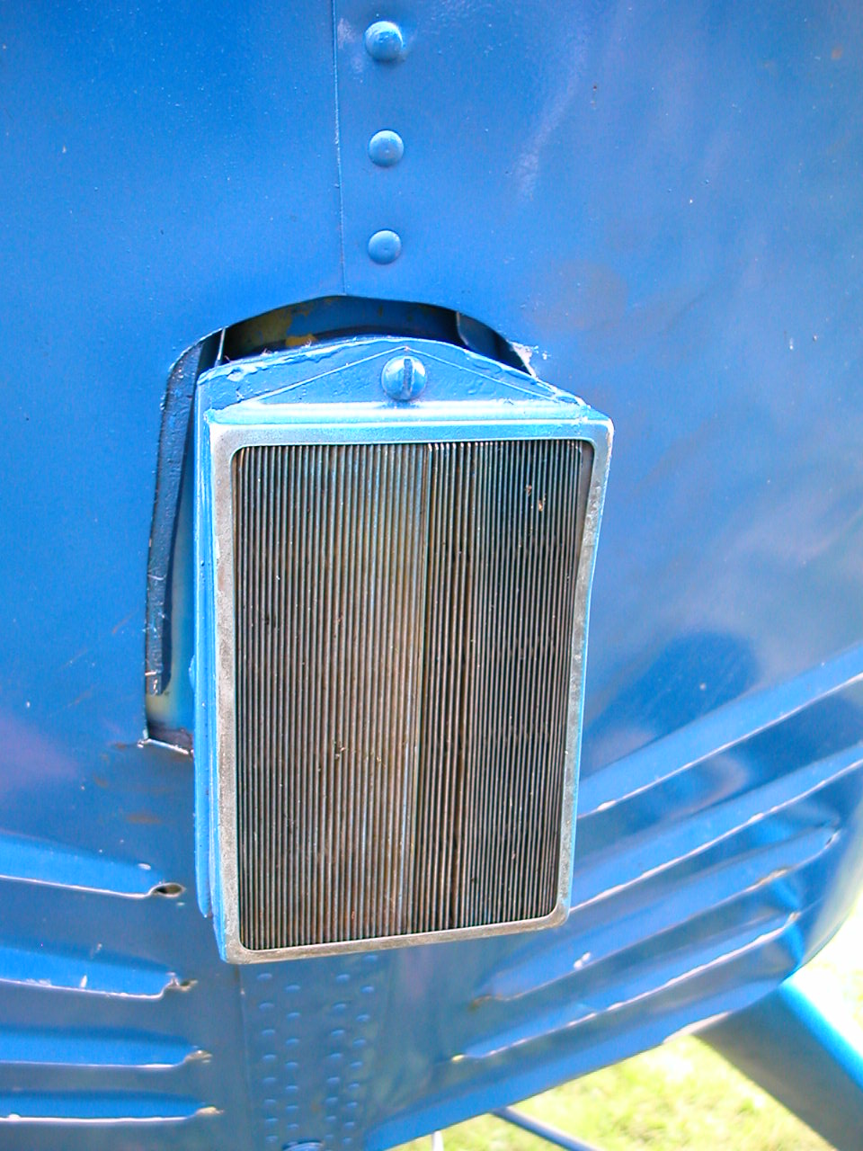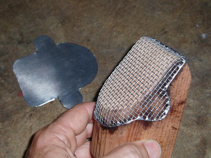 However, my restoration mechanic John Frisbie of Aircraft Restoration & Recovering in Kansas ([email protected]) made this grasshopper-catcher (left photo) for my airscoop. Actually, now he's made two -- another recently to replace the original I crushed in my nose-over incident. Two tiny screws through the mesh on the side ears hold it in place.