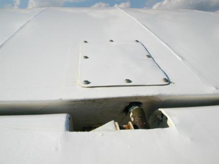 That's one inspection panel I didn't put on Crispy,maybe I should have but I didn't want any holes on the top side of the wing that might let moisture run in on the spar.It makes it a little hard to get into the bell crank but I can still get to it to service it and/or safty the cables if I ever have to do so. I have another T-craft that I bought in November and it has the rectangle plate onto of the wing and the length of it runs in the direction of the wing,it also has small sqare plates on the bottom of the wing at each hinge point and on the aileron as well.....not sure why they did that yet but I have not removed any of them yet either. I'll try to get some pics before I cut the fabric off.Kevin Mays