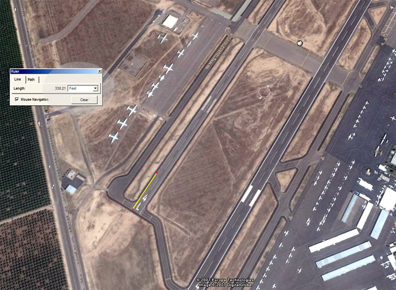 I noted where I stopped on the runway and then came home to measure it on a Google Earth image. 338' or so.