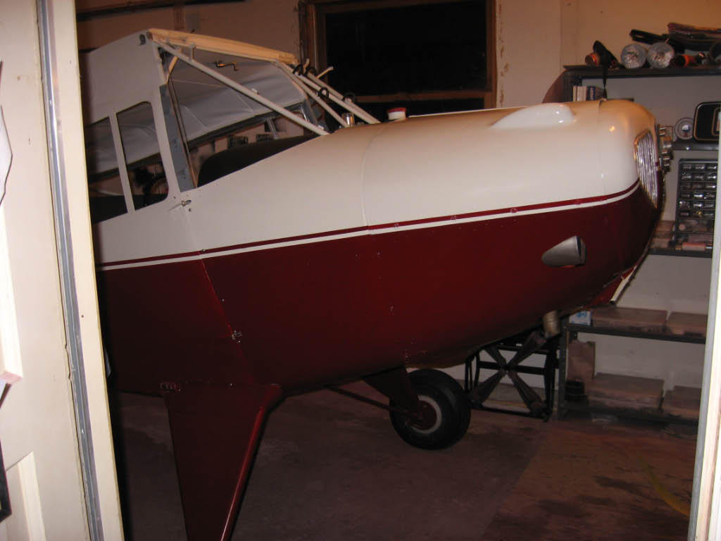 Here is the view through the door into my garage tonight. I spent the evening stripping the old fairing that goes on the base of the windshield (trying to salvage it for reuse). I do believe that after four years, that is the last piece of the old airplane that I had to strip! Hallelujah! No more yellow paint.