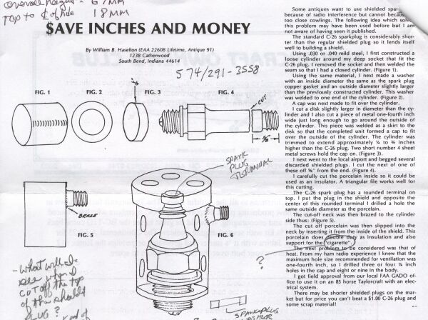 That was the article I started with. There were a couple of problems with that design that are easy to address. First I added in a small cross hole along the edge of the cap (like from the 12 o’clock position to the 3 o’clock position) that you can run a cotter key through to hold the cap on (it WILL pop off!). Second, you MUST make sure there is enough clearance between the top of the plug and the cap. If it is too close the spark will jump from the plug lead to the cap and the engine will run REALLY rough! I don't know if there will be problems with the washer bottom replacing the copper washer under the plug over time. It is the same way the Aerocoup cups work and there have been no complaints about them since the 30s or 40s but I think my cups are aluminum, not steel. The Aerocoup cups are getting REALLY old and if someone wanted to make these things up in a batch I'm sure there are a lot of people who would want them. I also think they could be made from thinner stock and silver soldered together. The shielding doesn't come from the thickness, it comes from the grounding and keeping the cooling holes small. I wonder if those small tomatoe paste cans would work?
