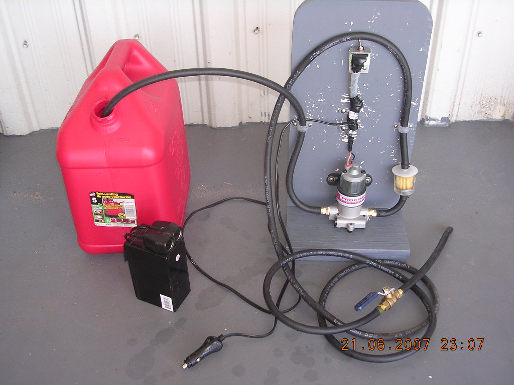 Because I am a little old and a little lazy I decided against lifting five gallon gas cans up to the wing and main tanks. For about a $100 investment I assembled a transfer unit. The pump is a 100 gallon per hour new unit from Ebay. The accessories are from Lowes hardware, Radio shack, the 5/16 hose and filter are from a local auto store. It is not necessary to to prime the pump and it has a bypass valve for when you turn off the globe valve at the tank. the system works fine. See attached picture