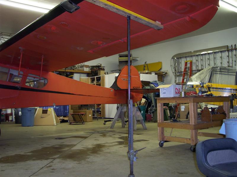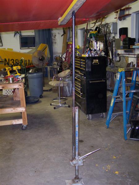 This is how I change out struts, works real good, the jack has worked to get me unstuck in overflow many a time. I am putting new airframes struts on this F-19. The top end of the pipe has two bolts welded, that fit on the strut at the wing and strut attach fitting and can't slip off. I am using it (in the picture) with a 2X4 that has two holes drilled, so the welded bolts fit in and hold the board in place. Pretty easy to build, also works good for changing from wheels to skis. Sometime back someone was asking how to jack up and change tires, so I thought I would post this.