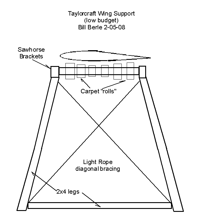 Make the legs however tall they need to be to reach the wing. The geometry will yield a very wide, stable "footprint". Tie the four legs together with light rope or whatever. If you want to get really fancy, C-clamp some 2x4's between the legs at the bottom to create a rigid pyramid kind of deal. If you're feeling really frisky, tie some rope diagonally to prevent the sawhorse from moving in any direction.
