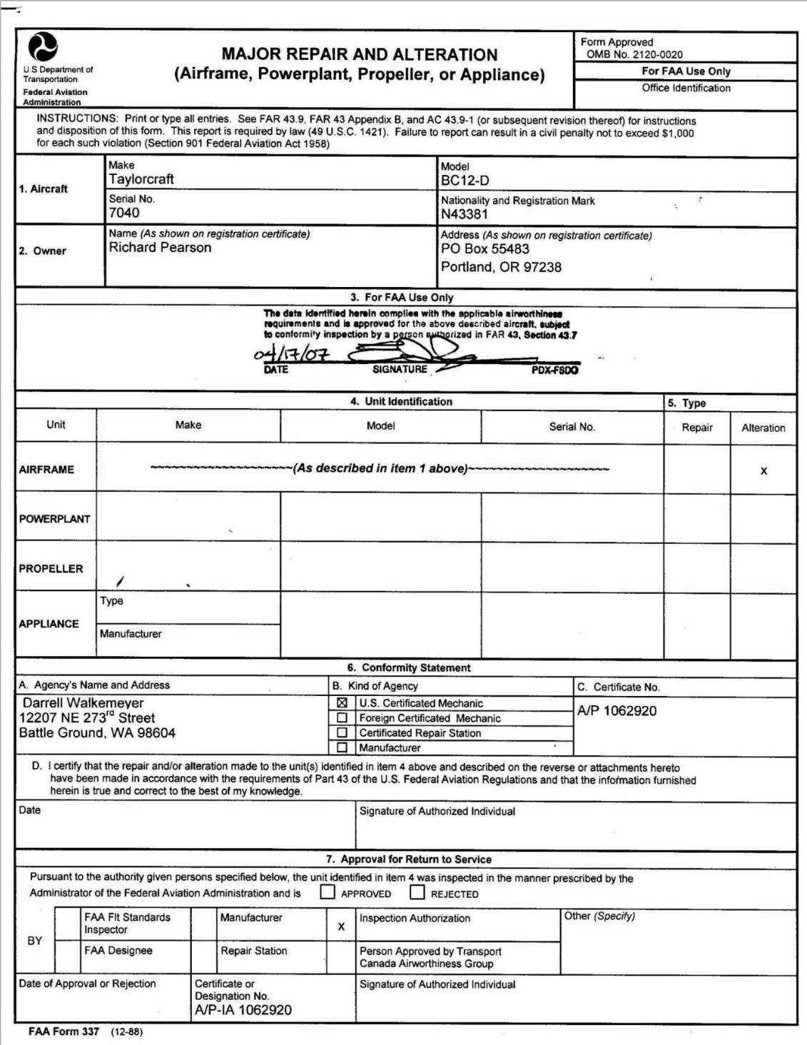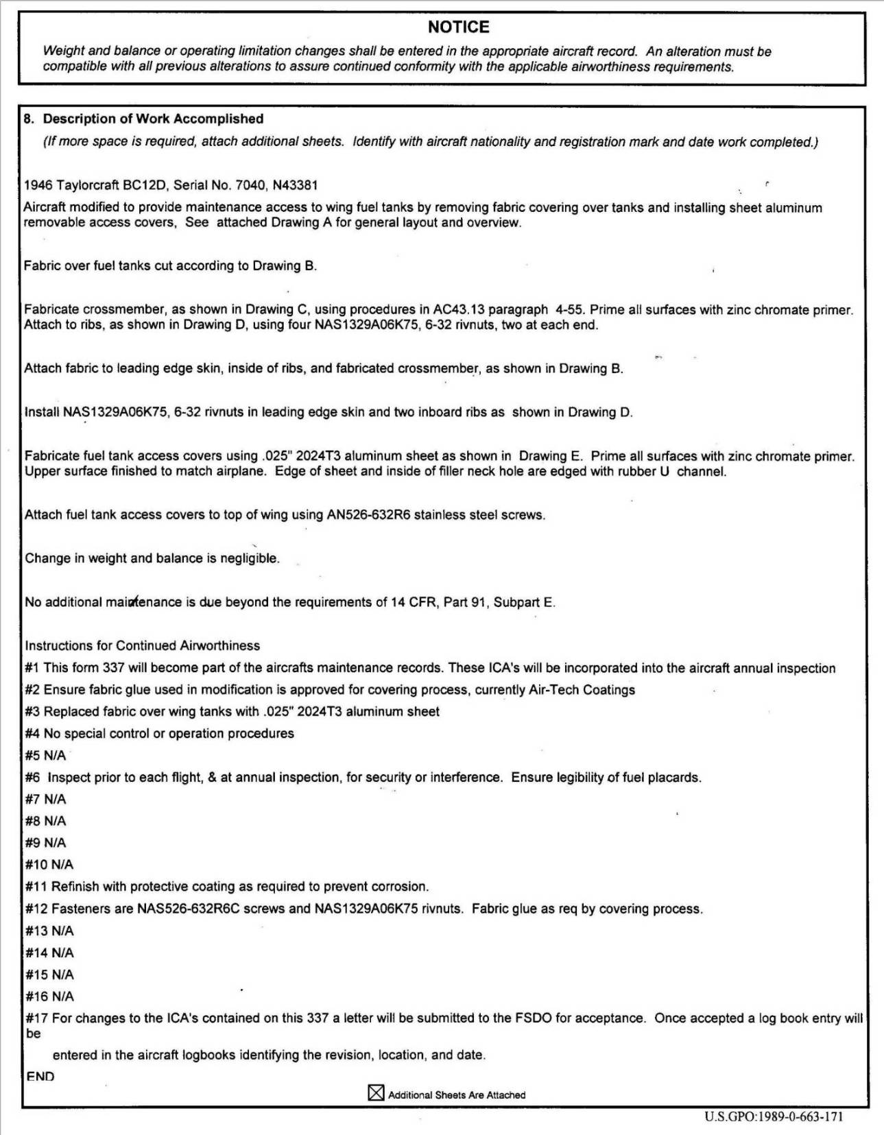Walt also sent me his 337. I am almost finished with mine. It enabled me to get approval without any problem. Also, finished product looks real good and really makes opening and inspection easy. So here's a real SHOUT OUT TO WALTER--THANKS FOR TAKING THE TIME TO HELP OTHERS!!