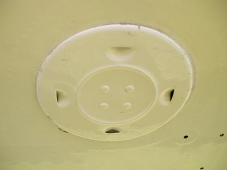OK, one more restoration detail to obsess about for Oshkosh judging next summer. Last year, one of the Vintage judges asked me what was the original style of the round inspection hole covers: two rivets/one strap, or four rivets/two straps with the vents?