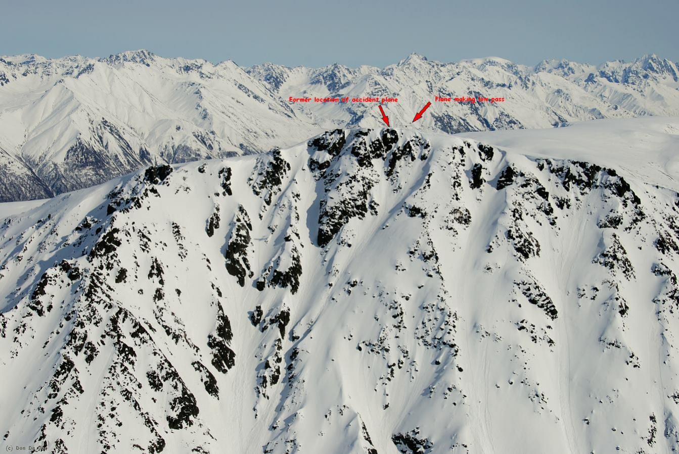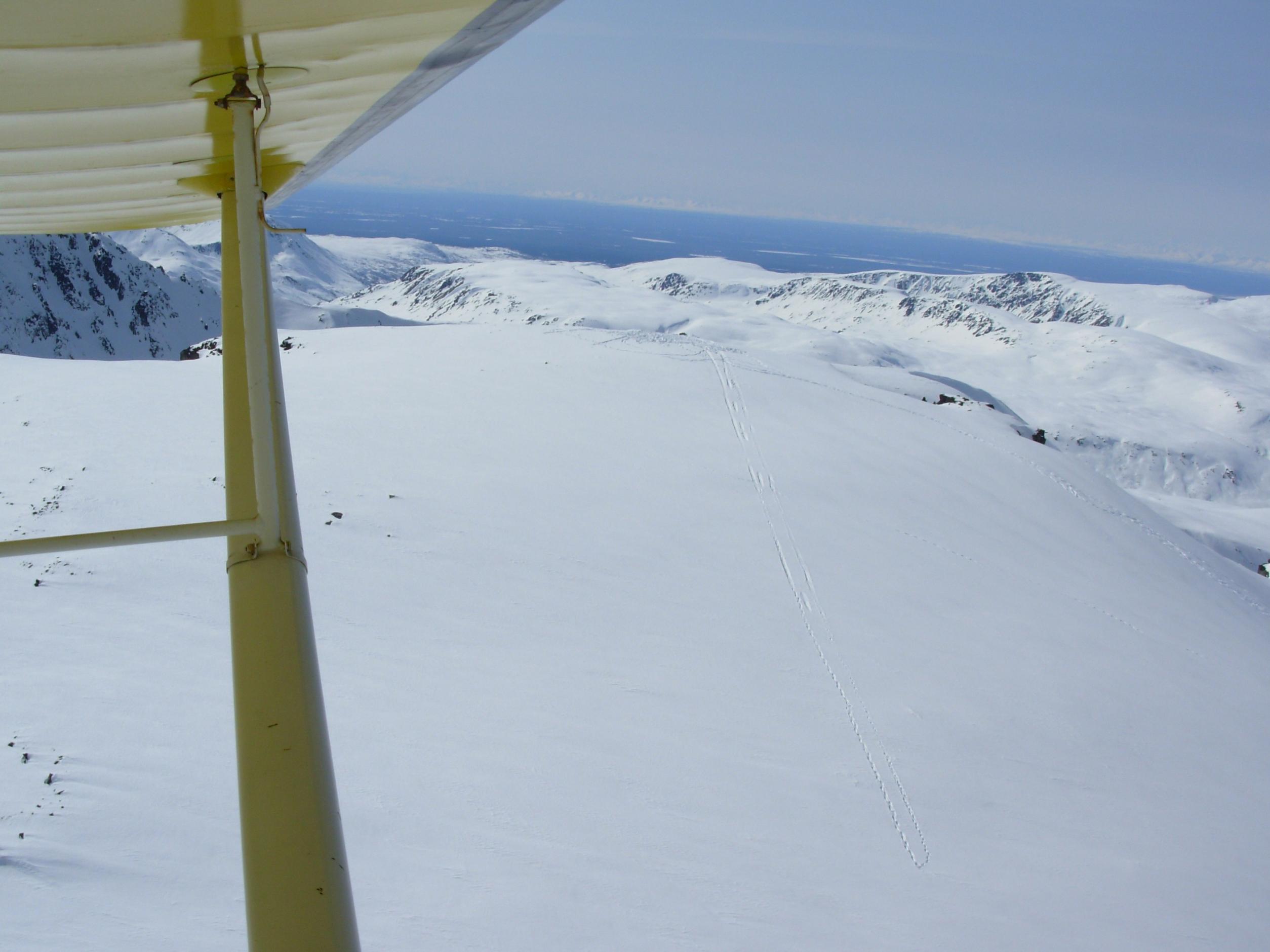 Yeah...no "photoshopping" for this picture! A couple of us flew up to check out the site today. Here is a shot of the ski tracks leading up to the edge of the cliff and a shot flying directly over the location to show the scale of the mountain. Look real closely to see the T-Craft flying over the spot of the 'incident'.
