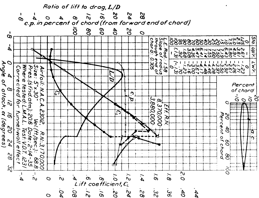 The airfoil is a 23012, 12% thickness/chord ratio; I'm sure a quick Google will provide the salient data. Chord is 5'6" approx.