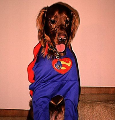 As for "Danny" (his secret identity) he gets totally weird every fall when he knows the kids are coming for Halloween. Maybe it's the bags of candy that reminds him but ever since he was a puppy (he's 10 now) he has loved Halloween. He can't seem to wait for my wife to dress him up and when he outgrew his "Super Dog" suit he was really upset that he couldn't get into it.