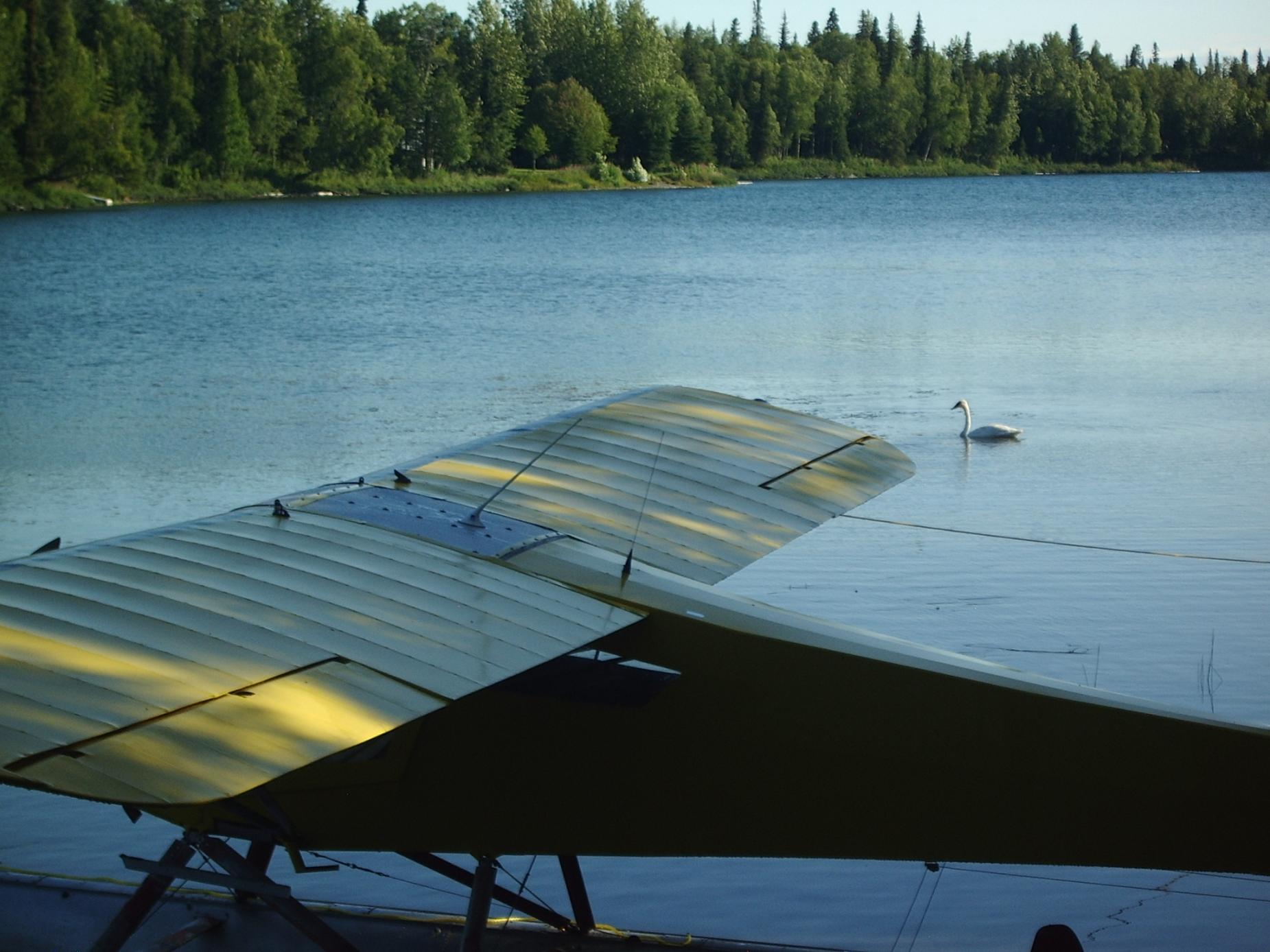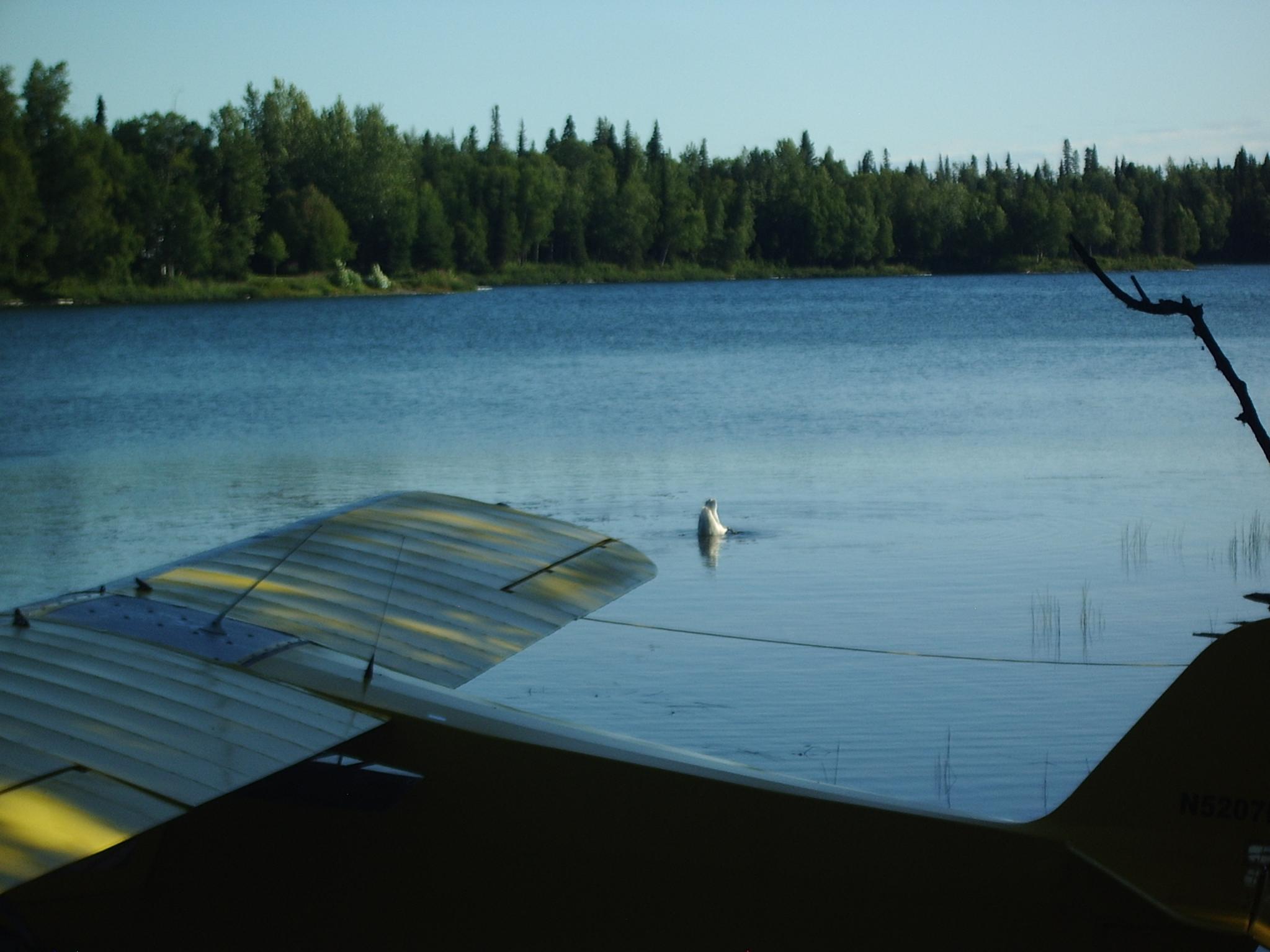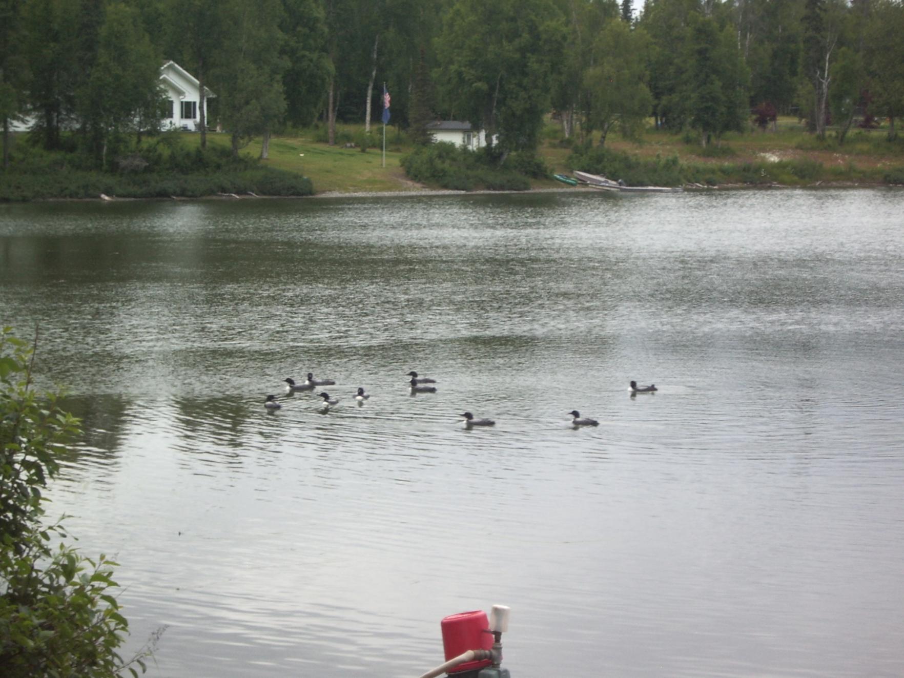 These critters are a bit easier to put up with than seagulls...early morning and late evening are the favorite times to "check the tiedowns". Never know what you will see. Loons are often thought of as pretty solitary birds. We often have a pair nest on this lake and they get pretty defensive. This year a "gang" of loons is really working the small trout population over. When you watch them through the spotting scope under certain lighting conditions, they look like a battle group of warships intent on a mission. This single trumpeter swan has been showing up the last few days. Dick