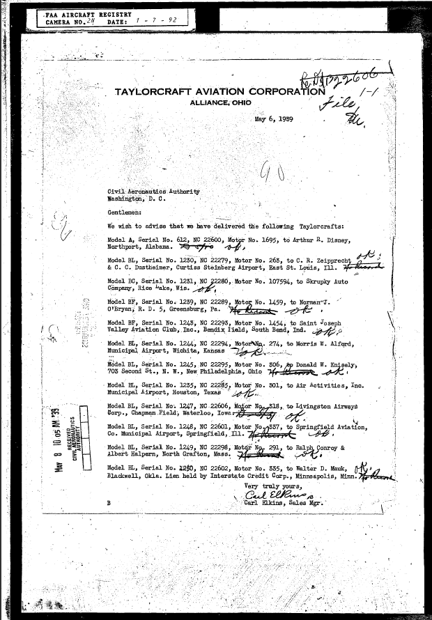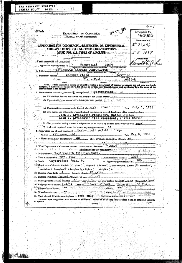 I attached a few copies from the CD here just because I thought they might be of interest. Livingston Airways in Waterloo Iowa delivered 22606 that same week to the first private owner, also in Iowa.