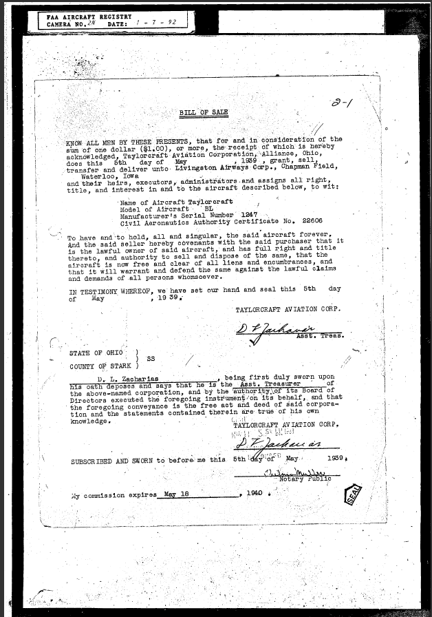 To add a little to Howard's info, the FAA CD says that my BL, NC22606, S/N 1247 was manufactured 5/5/39. Should be close to the same date as your NC22618, but its not listed on the 5/6/39 delivery notice copy that I have. Doesn't mean a thing though I'm sure because they seem to be out of sequence mostly anyway.